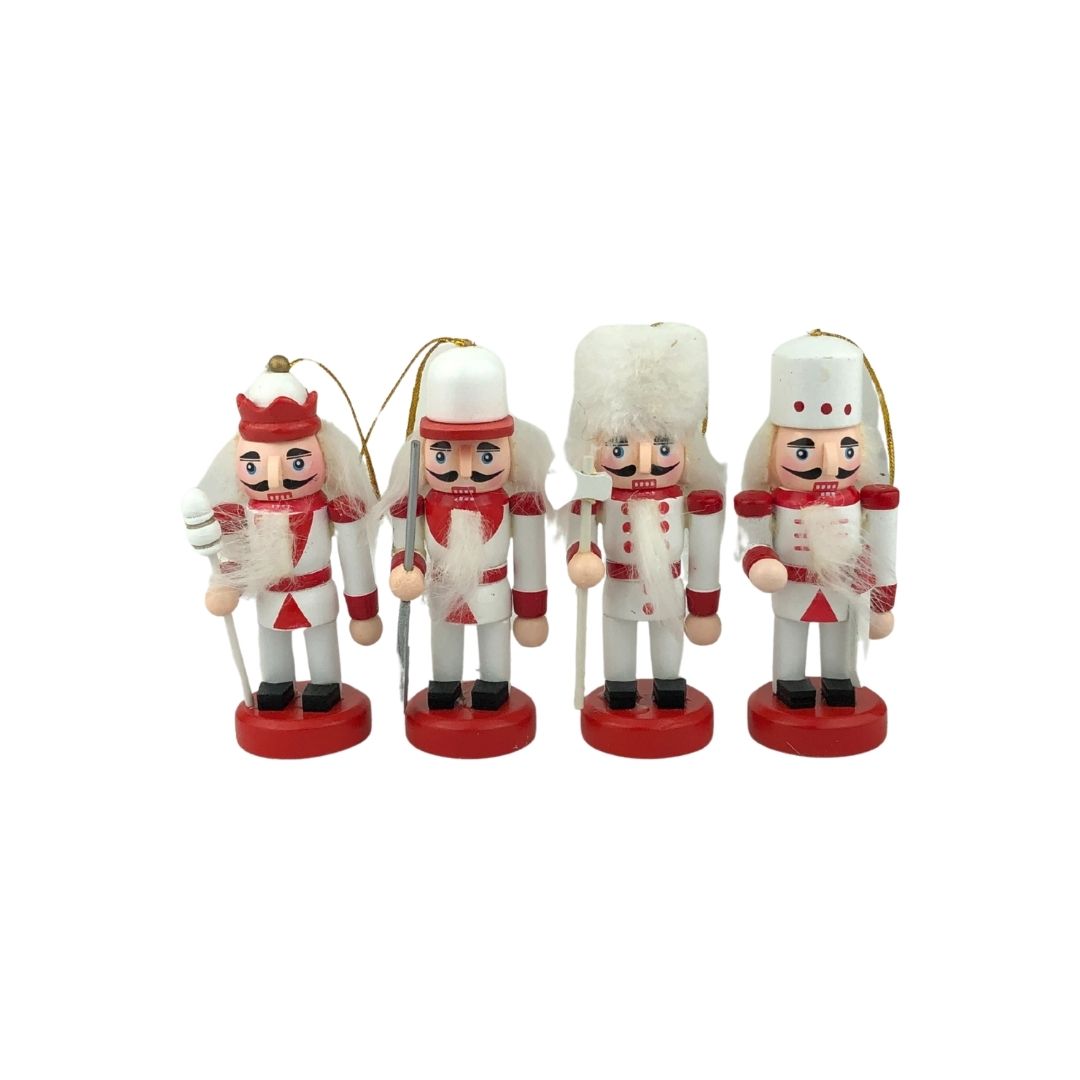 Set de 4 cascanueces de 10 cm, en blanco, rojo y negro, con bases rojas y colgante dorado, perfectos para decorar tu Navidad.
