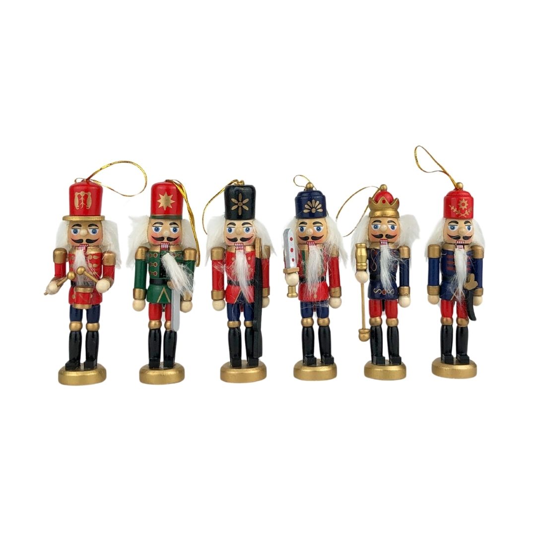 Set de 6 cascanueces navideños de 12.5 cm, con colores vibrantes y detalles dorados, listos para colgar y presentar en su elegante caja con cubierta de PVC.