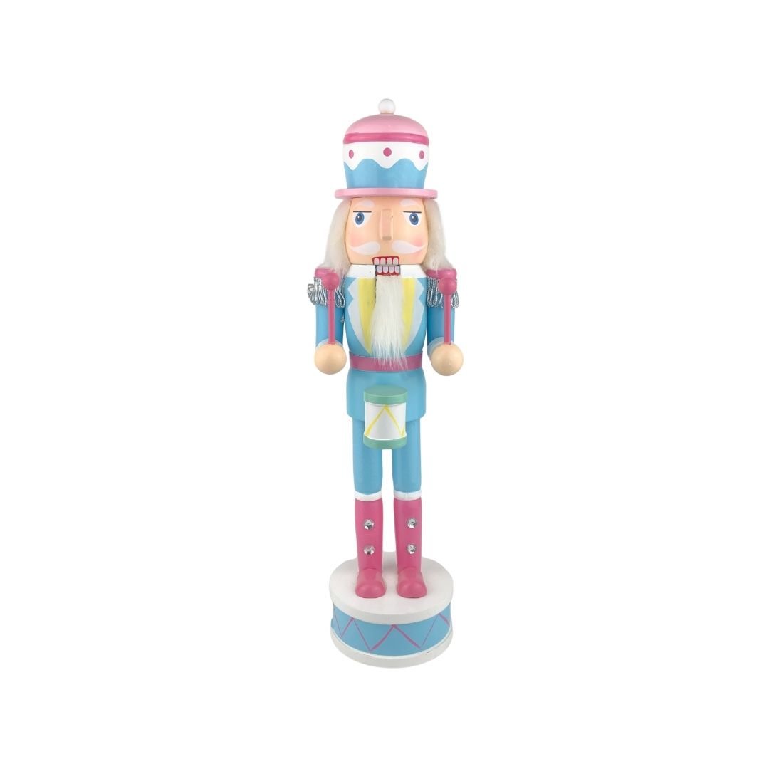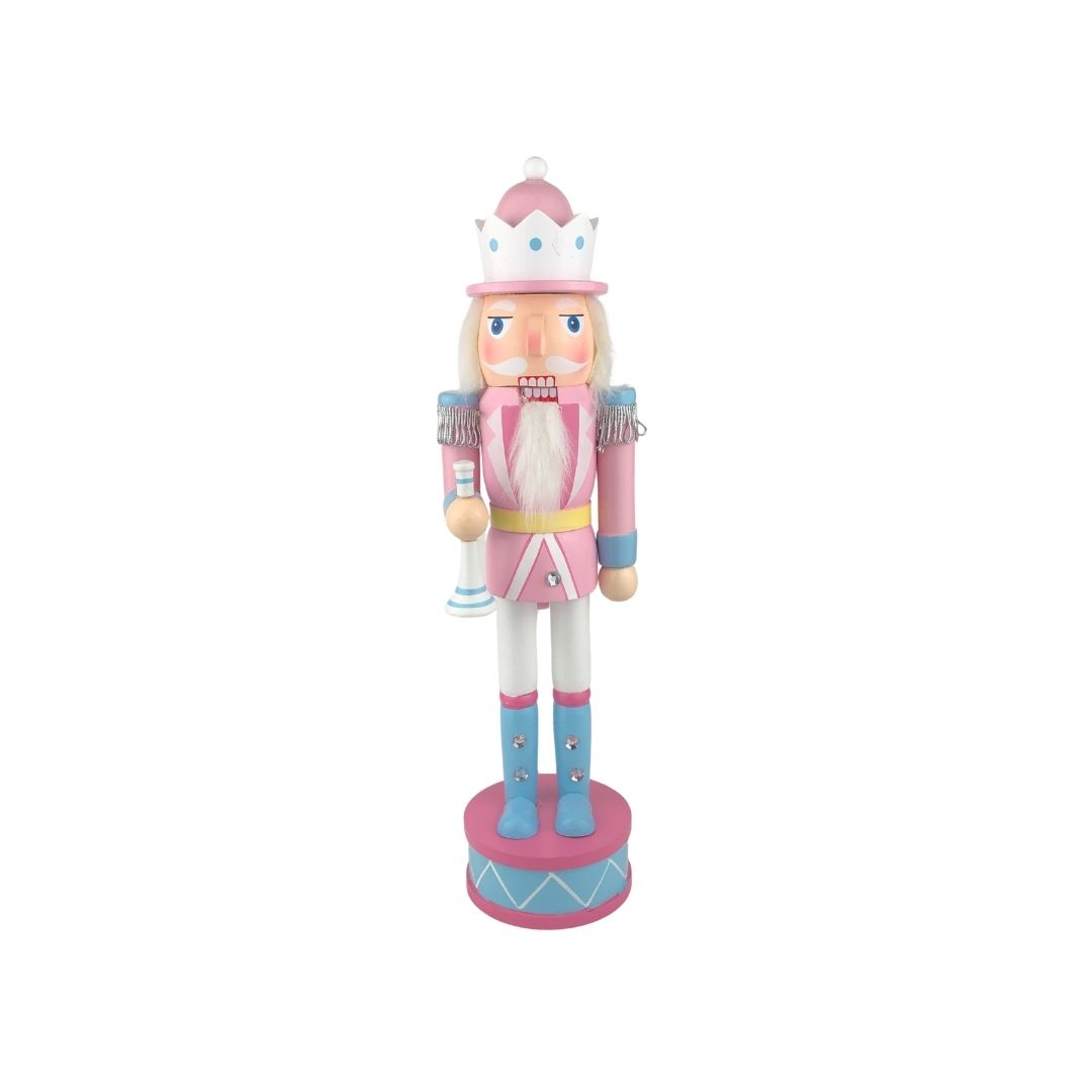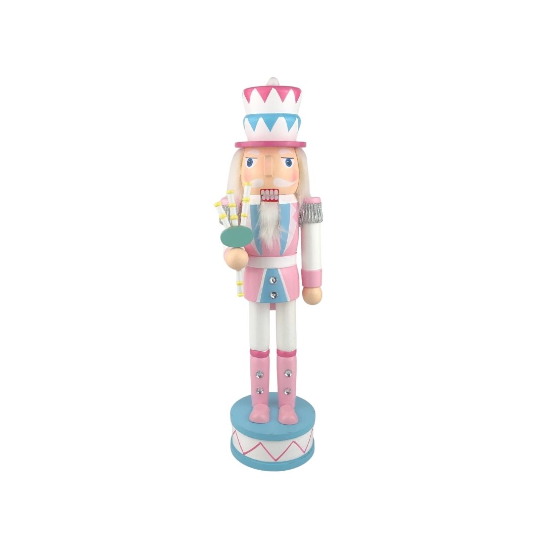 Decora tu hogar con estos cascanueces de 38 cm, disponibles en 4 estilos individuales y vendidos por separado. Cada figura de madera tiene un diseño único con paleta de colores pastel, combinando rosa, azul y blanco. El primer cascanueces sostiene una guitarra rosa, el segundo un tambor azul con detalles dorados, el tercero una trompeta plateada y el cuarto un ramo de flores blancas. Todos visten uniformes detallados y sombreros a juego, con barba blanca y se apoyan sobre bases redondas decorativas. Con colores suaves y detalles encantadores, estos cascanueces aportan un toque alegre, elegante y festivo a cualquier espacio durante la temporada navideña.