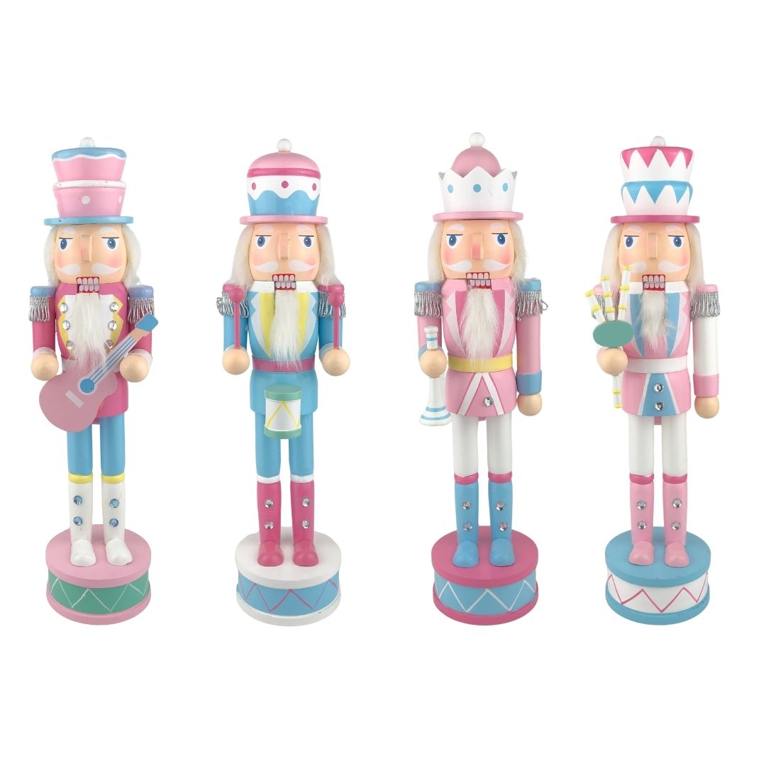 Cascanueces de 38 cm en 4 estilos individuales, vendidos por separado, con colores pastel y accesorios musicales o decorativos para una Navidad alegre y festiva.