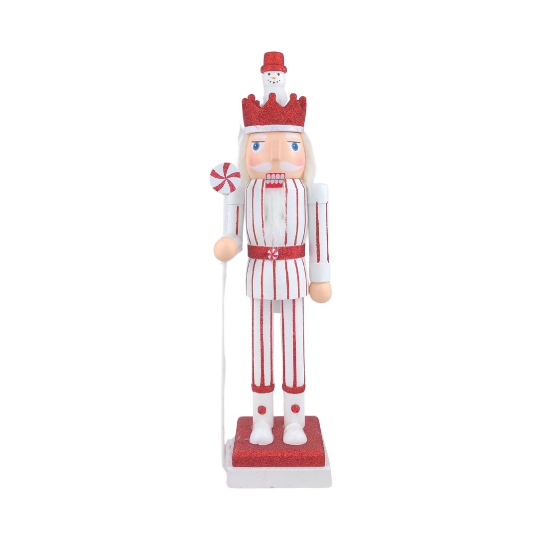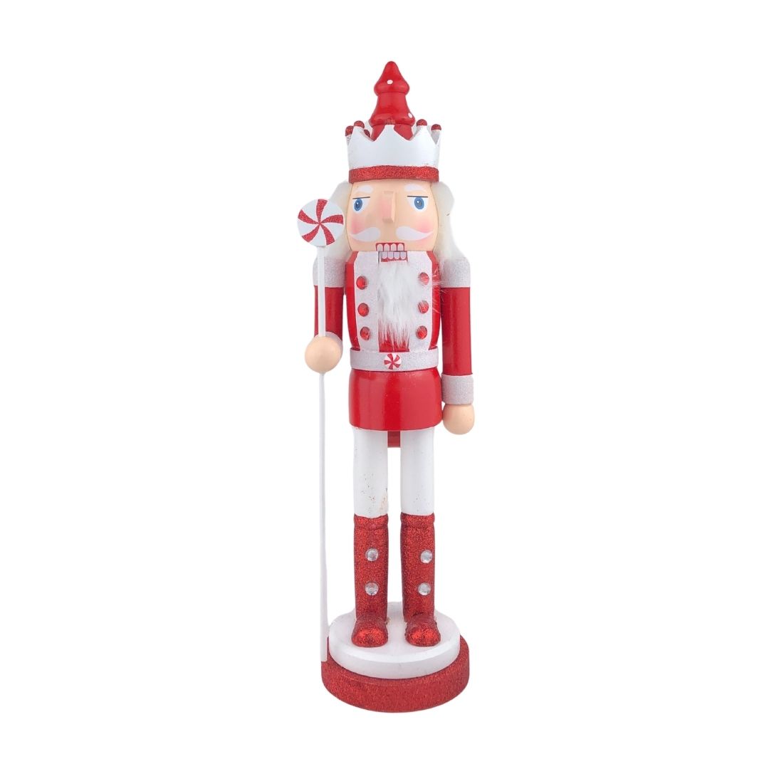 Cascanueces decorativo de 38 cm con uniforme rojo y blanco, detalles dorados y base elegante, ideal para Navidad.