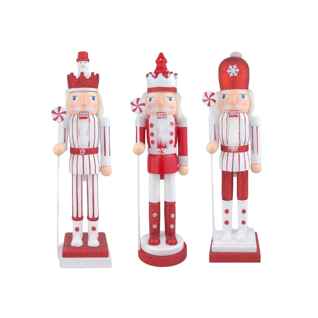 Agrega un toque festivo a tu hogar con este cascanueces decorativo de 38 cm. Cuenta con uniforme rojo y blanco con detalles dorados, rostro pintado con ojos azules y bigote blanco, y base decorativa que le brinda estabilidad y estilo. Perfecto para colocar sobre mesas, estantes o como parte de tu colección navideña, aportando tradición y espíritu festivo a cualquier espacio durante la temporada navideña.