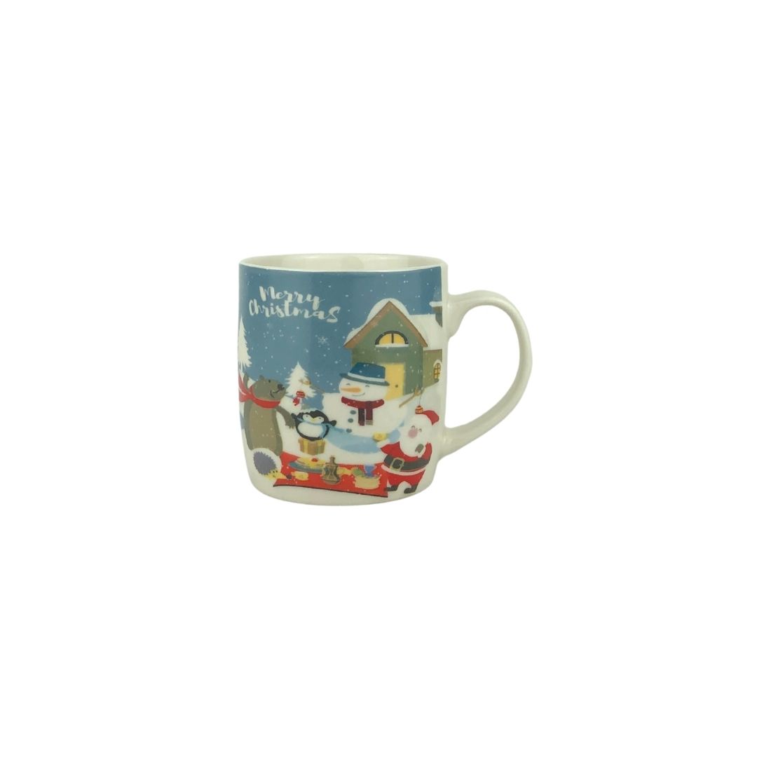 Estas tazas navideñas de 350 ml presentan diseños individuales con escenas festivas sobre un fondo azul claro que simula una noche nevada. Una taza muestra un muñeco de nieve sonriente junto a Papá Noel, un reno y un pingüino, todos celebrando alrededor de una mesa, con la frase “Merry Christmas” en la parte superior. La otra taza presenta a Papá Noel abrazando a un muñeco de nieve frente a un árbol decorado, acompañado de un reno, también con la frase “Merry Christmas”. Fabricadas en cerámica de alta calidad con asas cómodas en forma de “C”, son perfectas para café, té o chocolate caliente, y un detalle festivo para regalar o decorar tu hogar durante la Navidad.