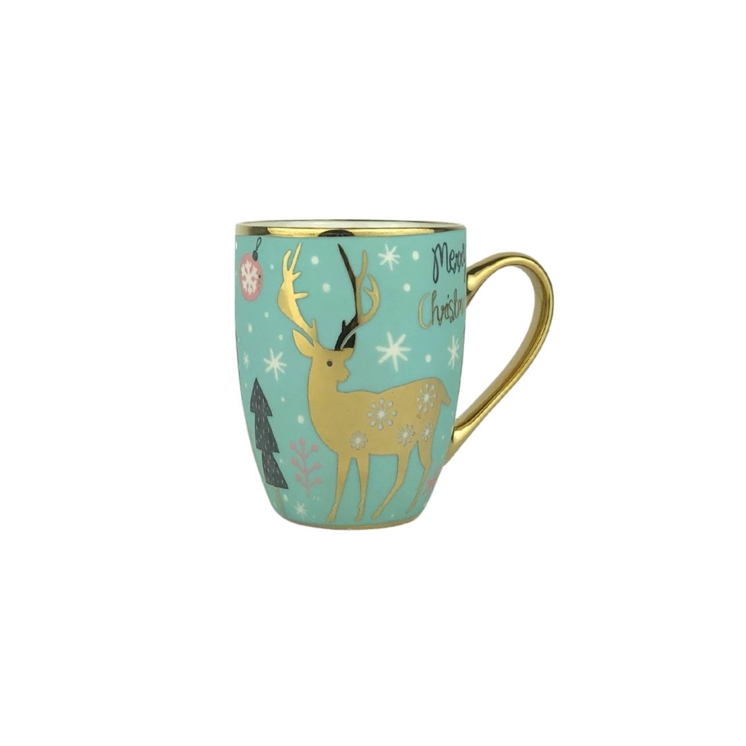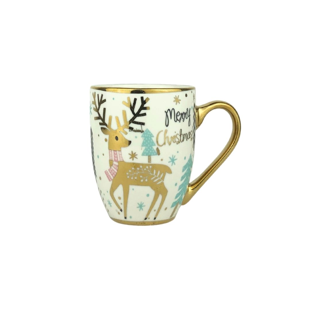 Taza navideña individual de 13 oz con diseño de reno y detalles dorados, disponible en 2 estilos.